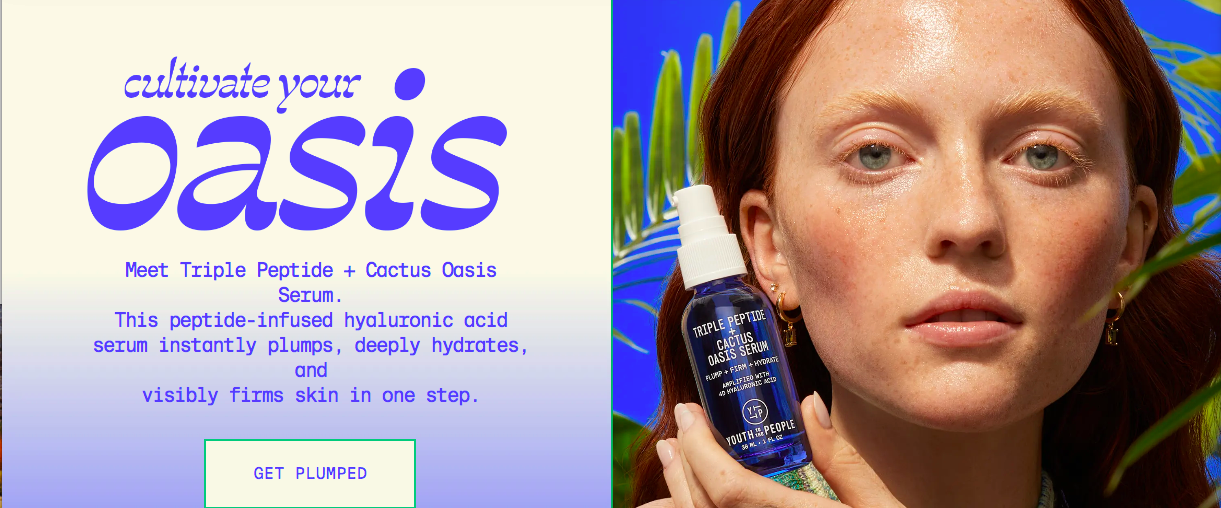 The 90s are making a huge comeback and not just in fashion (I never thought I’d own a bucket hat again). Basic fonts back to the early 90s day of the internet, with a touch of bold headline fonts are being seen across many young-appealing brands (Youth to The People) below.